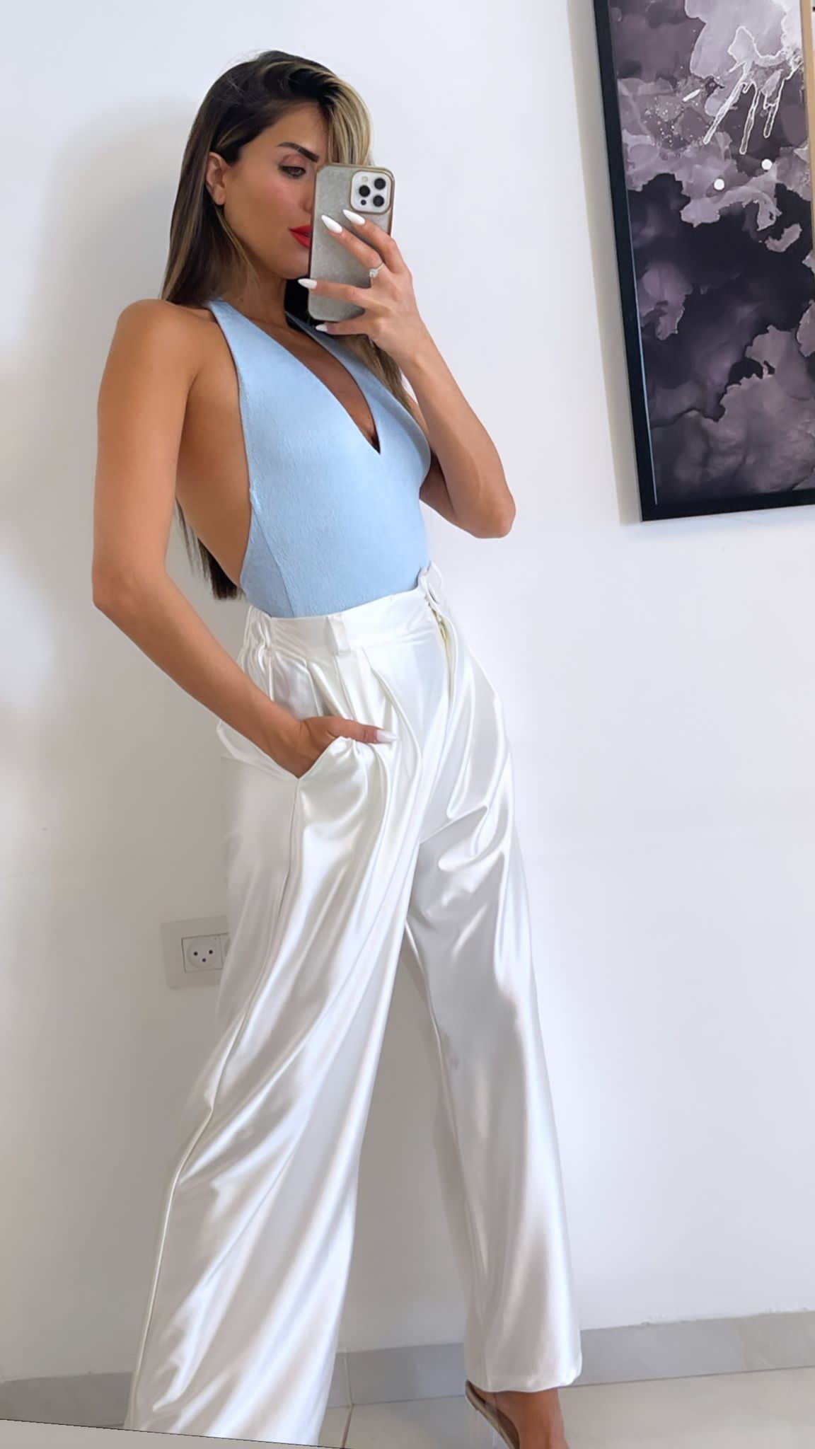 בגד גוף מבד גמיש עם טקסטורה בגזרת קולר עם גב חשוף.