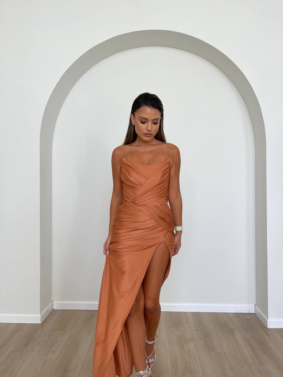 שמלת מקסי עם בסיס מחטב ומחוך פנימי בנוי, שסע עמוק, למראה ערב עוצר נשימה